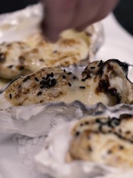 5. Slather each oyster with approx 2 tsp of mayonnaise per oyster, adding thin slices of red pepper or candied salmon or sesame seeds as a topping.